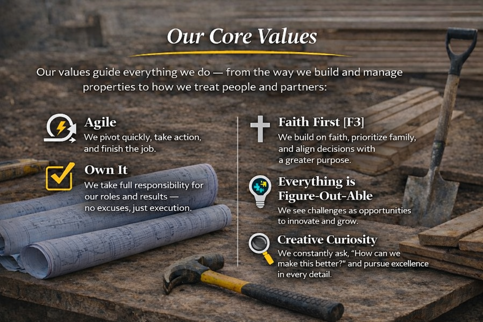 Our people are guided by five core values—F3, Own It, Figure-Out-Able, Creative Curiosity, and Agile—spurring actions that honor faith, family, and community.
